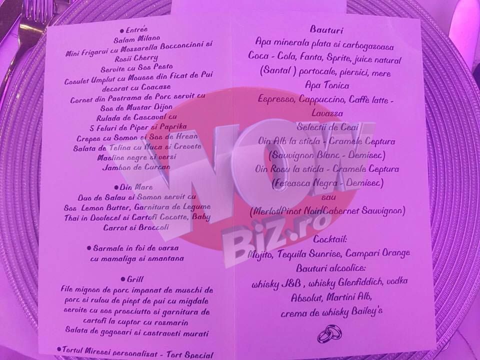 Invitatii au fost serviti cu preparate alese, printre care s-au numarat cosulete umplute cu mousse din ficatei de pui si decoct de coacaze, crepes cu somon, duo de salau si somon, sarmalute traditionale, rulouri de pui cu migdale, dulciuri sofisticate, fructe si tortul special al mirilor, toate udate din belsug cu bauturi fine si cocktail-uri pentru toate gusturile.