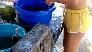 Daniela Crudu si Sorana sunt ajutate de Paula Chirila sa se spele la lighean.