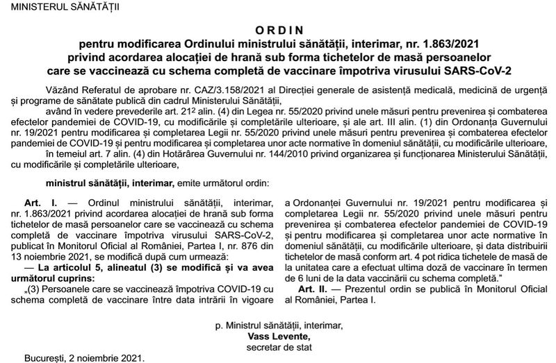 Noua măsură care modifică articolul 5, alineatul 3 din ordinul 1863/2021, privind acordarea alocației de hrană sub forma tichetelor de masă persoanelor care se vaccinează cu schema completă de vaccinare împotriva virusului SARS CoV-2, a intrat în vigoare, fiind publicat în Monitorul Oficial.