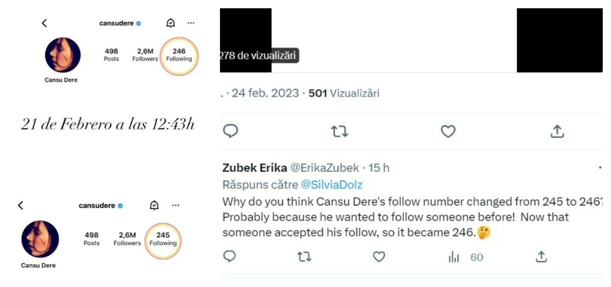 Este vorba despre o posibilă activitate a lui Cansu Dere pe Instagram. În fotografia postată pe internet se poate observa cum numărul conturilor pe care protagonista din "Infidelul" le urmărește a crescut în ultimele zile, ceea ce ar însemna că a fost intrată pe rețelele de socializare: "Nu am comentat până acum, dar am văzut mișcare pe profilul de Instagram al lui Cansu Dere. Date fiind circumstanțele, sper că este în cea mai bună stare posibilă.", a fost mesajul transmis de una dintre fanele actriței pe Twitter.