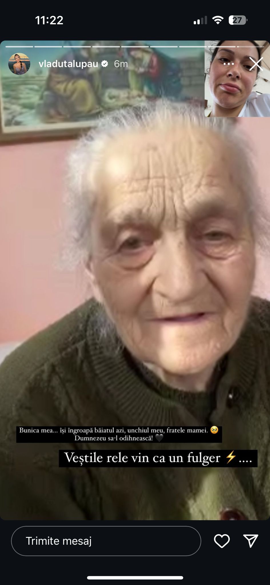 „Bunica mea… își îngroapă băiatul azi, unchiul meu, fratele mamei. Dumnezeu să-l odihnească! Vești rele vin ca un fulger…”, a fost mesajul scris de Vlăduța Lupău pe Instagram, în urmă cu puțin timp.