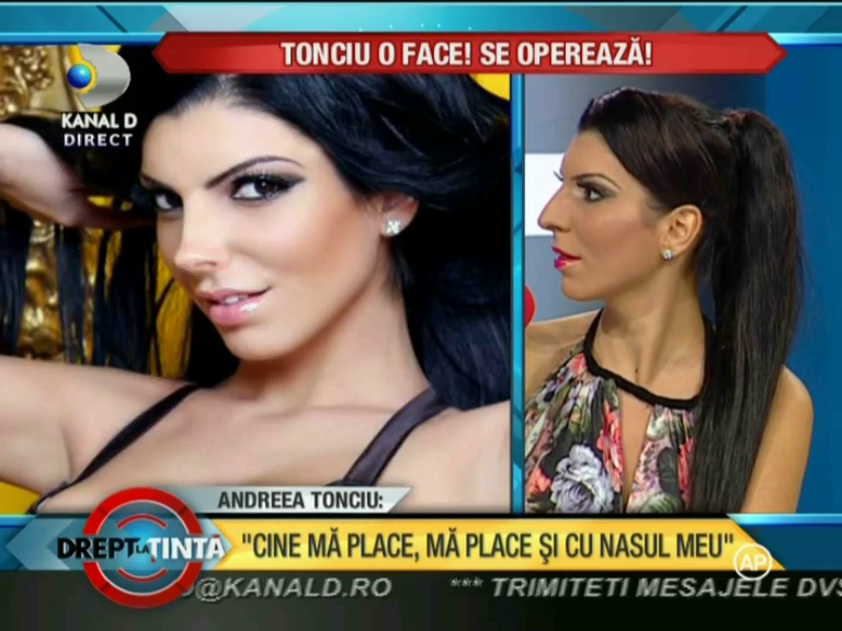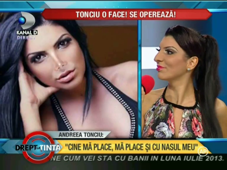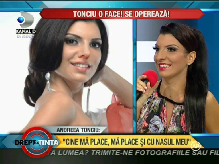Andreea Tonciu ar putea sa aleaga intre mai multe forme de nas. In cadrul emisiunii Drept la Tinta, vedeta a putut sa vada cum i-ar sta cu nasul lui Michael Jackson, Nicole Kidman sau chiar al Victoriei Beckham.