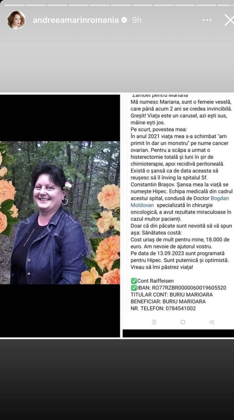 Andreea Marin și-a îndemnat toți urmăritorii să ofere o mână de ajutor Marianei, care suferă de cancer ovarian și care are nevoie de suma de 18 000 de euro pentru a putea fi supusă procedurilor medicale de specialitate, care sunt și foarte costisitoare. Punând mână de la mână, fosta prezentatoare TV speră ca întreaga sumă să se strângă, iar femeia aflată la mare necaz să aibă o șansă, după ce în ultimii doi ani s-a luptat cu toate armele pentru a rămână în viață.