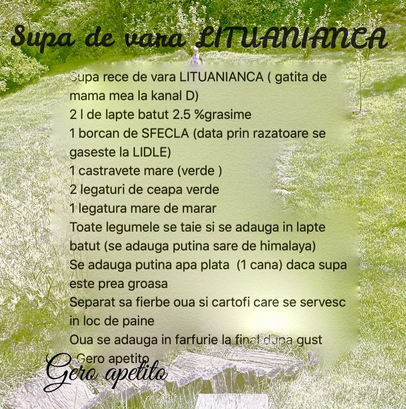 „Dupa emisiunea de marti seara la kanal D am primit o multimea de mesaje .. Va multumesc foarte tare… Ati cerut reteta de SUPA RECE DIN LAPTE BATUT PREGATITA DE MAMA, asa ca m-am grabit sa va satisfac curiozitatea. Sa nu uitati ca acesta supa este foarte sanatoasa si nu va ingrasa, desigur daca nu exagerati cu cartofii. Pofta buna”, a scris Vica Blochina pe contul sau de socializare.