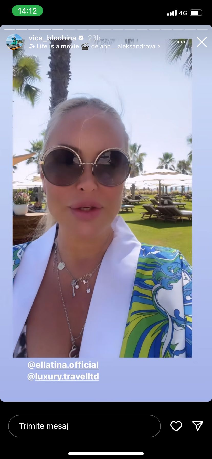 „După foarte mulți ani am ales să merg în Turcia la un resort, eu nu sunt adepta resorturilor, că aici de obicei e mai mult pentru copii, dar acum sunt într-o locație pe care foarte multă lume a lăudat-o, aici găsești absolut tot ce ai nevoie. Pentru că eu mi-am făcut o operație la stomac, eu nu pot merge la distracție, nu pot nici să mănânc, nici să beau, și am zis să fac ceva pe liniște, am ales un resort foarte mișto în Turcia, am all-inclusive, pot să ciugulesc când vreau eu, prefer să mănânc foarte puțin, dar mai des. Sunt condiții foarte, foarte bune aici, am ales Turcia cea mai convenabilă variantă pentru acest an. Sigur dacă mergeam în altă parte mai pe distracție îmi era greu și sigur greșeam din punct de vedere alimentar. Stau o săptămână în vacanță”, a spus Vica Blochina, conform Spynews.ro.