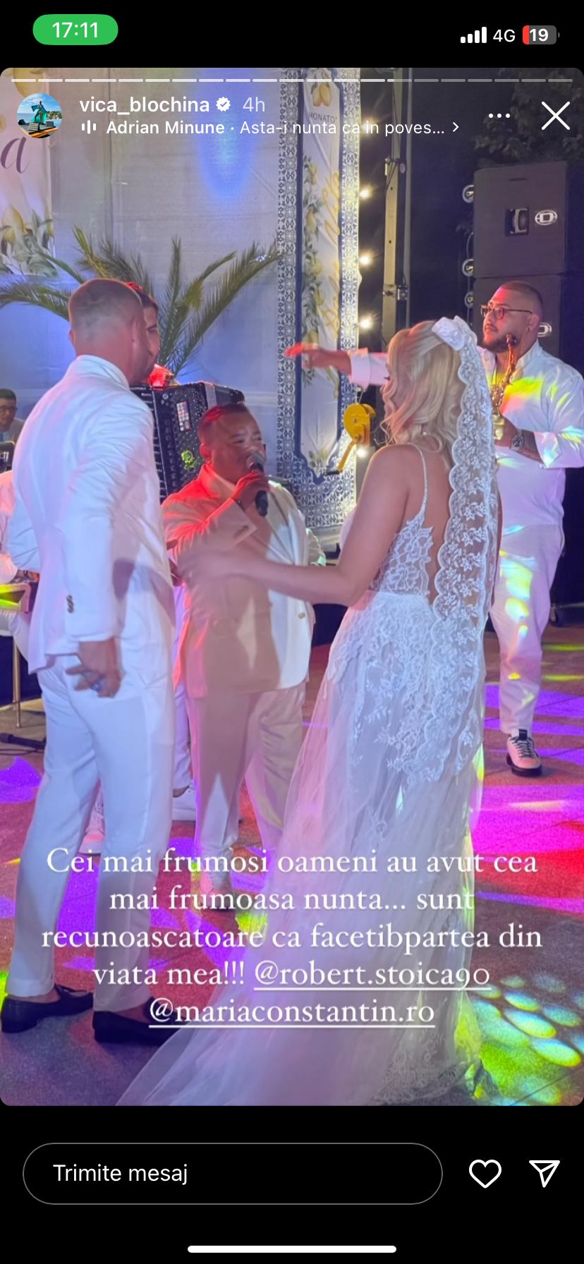 În urmă cu două zile, a avut loc nunta Mariei Constantin cu Robert Stoica. Artista a abordat o tematică atipică pentru un astfel de eveniment, setând dress cod-ul petrecerii ca toți invitații să poarte ținute albe, din cap până în picioare. Vica Blochina a fost și ea prezentă la eveniment, acolo unde s-a distrat pe cinste, însă care a ales să poarte o rochie crem, și nu albă. Chiar dacă s-a deosebit de mulțime, vedeta s-a distrat pe cinste, stând la masă cu buna sa prietenă, Bianca Drăgușanu, care, de asemena, a ieșit din tipar cu ținutele sale demne de admirat. Cu numai câteva ore în urmă, Vica și-a expus părerea sinceră despre nunta artistei, postând și o serie de imagini de la locul „faptei”.