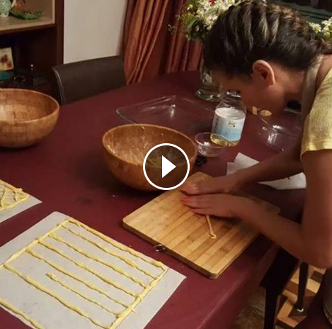 Aluatul: apa se pune in oala, dupa ce clocoteste pui unt si sare, dupa ce untul s-a topit complet adaugi faina si foarte repede amesteci aluatul. Se ia de pe foc, lasam sa se raceasca putin, apoi adaugam ouale (pe rand cate un ou, amestecand aluatul dupa fiecare), apoi luam o hartie de copt si facem forma tortului pe care ni-l dorim(se deseneaza forma separat pe hartie). Se face din 4 foi, fiecare impletita diferit – urmariti video.