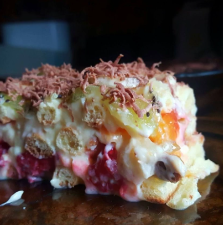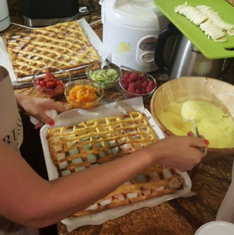 Luam prima foaie de blat, o punem pe foaia de copt si incepi sa pui fructele si crema, spatiile printre blat sunt predestinate fructelor astfel incat faci straturi generoase de crema si fructe. Cand vi cu urmatoarea foaie apesi usor peste compozitie. La final se decoreaza dupa gust!”, a scris Anna Lesko pe contul sau de socializare!