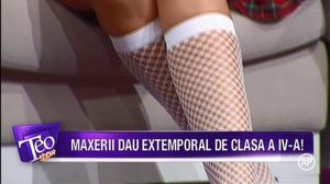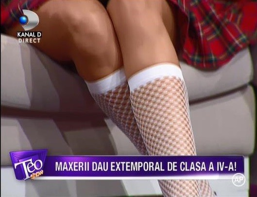 Cu ciorapi plasa, albi, pantofi cu toc, fustita la limita decentei si nelipsita camasuta. Asa si-a facut aparitia Deea Maxer in platou la „Teo Show”. Pentru ca tinuta sa fie completa, Deea si-a prins parul in codite, asa cum o facea cand era in clasele primare. Mama, mama, la cat de sexy e, seara asta va fi cu siguranta una incendiara pentru cuplul Maxer.