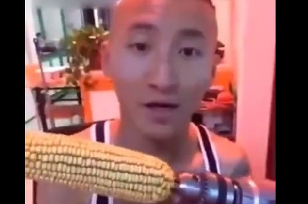 Un chinez a vrut sa se dea mare pe internet asa ca a zis ca ar fi o idee buna sa se filmeze incercand sa manance un porumb plasat pe o bormasina.