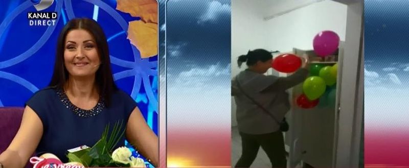 „Nici nu stiu cum sa reactionez. Astazi de dimineata cand am venit la Kanal D mi s-a intamplat o intamplare sa zic asa”. Frumoasa prezentatoare a avut parte de o mica surpriza cand a intrat in vestiar. Cand a deschis dulapul in care ar fi trebuit sa se afle hainele pentru emisiune, o multime de baloane pline cu heliu au iesit de acolo.