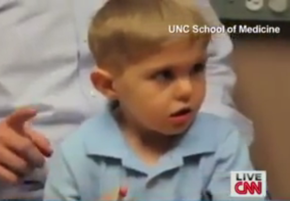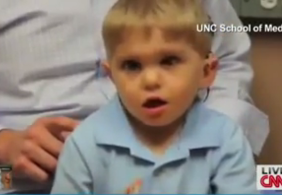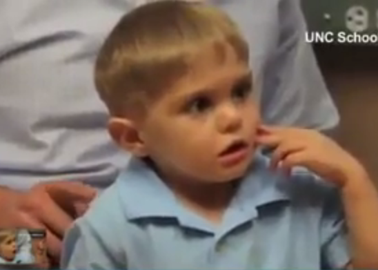 Grayson Clamp, in varsta de trei ani, din Carolina de Nord s-a nascut surd. Parintii au fost de acord ca baietelului sa i se implanteze un microcip la baza creierului.