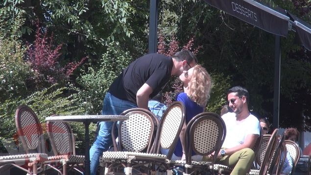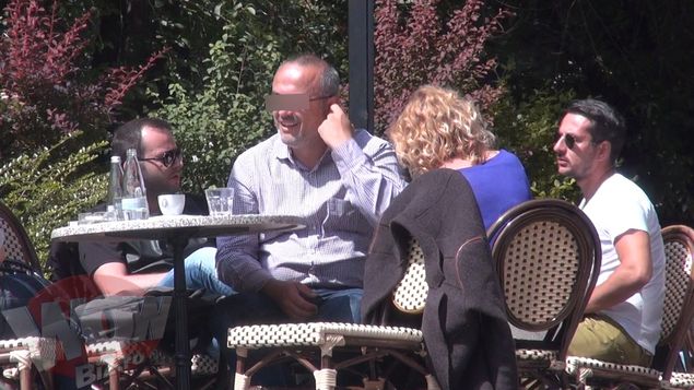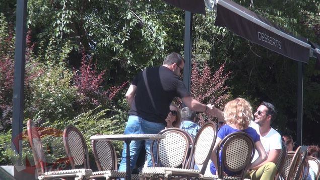 Cei doi se afla la o terasa, alaturi de partenerele lor de viata: Mihai Morar cu sotia lui, Gabriela, iar Ducu Ion cu iubita sa, actrita Ioana Blaj.