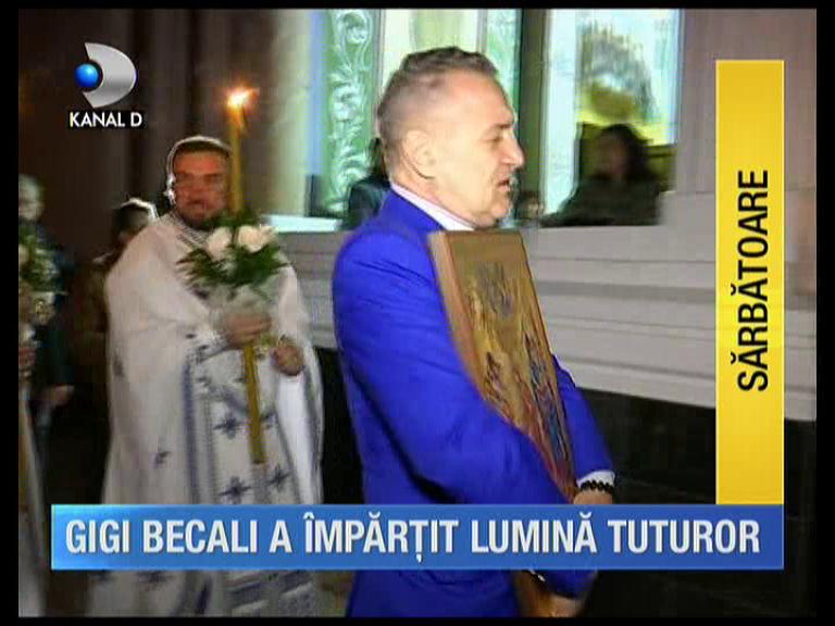 Gigi Becali a venit la slujba cu 15 minute dupa 23:00 insotit de sotia si fiicele sale. Omul de afaceri nu a asteptat in curte Lumina, ci a mers sa o ia din biserica, direct de la preoti. A iesit apoi afara si a impartit-o cu ceilalti enoriasi. Mai mult decat atat, Gigi Becali s-a implicat in slujba si a facut inconjurul bisericii cu o icoana in brate, cantand cu foc.