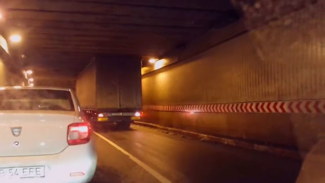 Imaginile astea au devenit viral imediat pe internet. Un camion nu a respectat restrictia de inaltime din Pasajul Unirii si a ramas blocat.