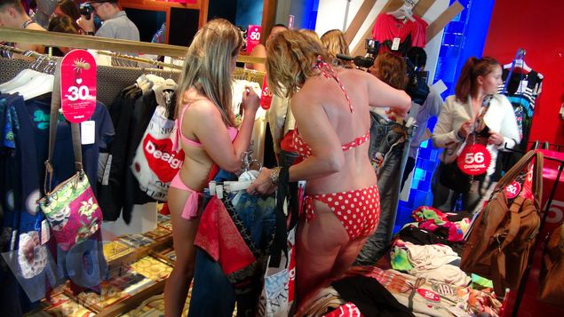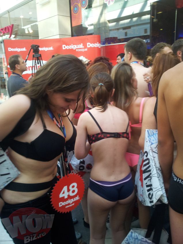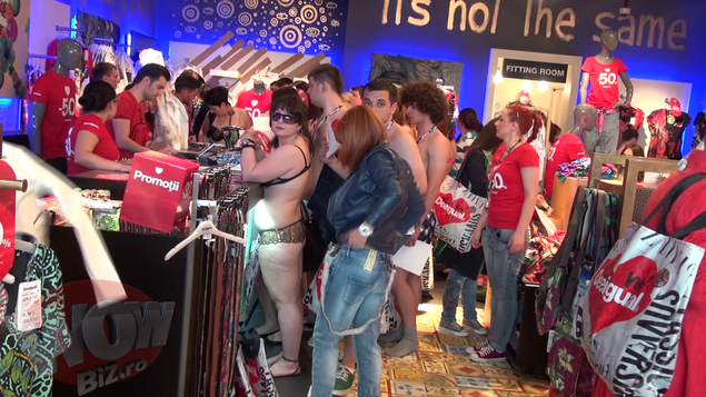 Sute de oameni s-au inghesuit la ora 8 in fata magazinului care a gazduit petrecerea-fenomen Boutique-ul a deschis usile la ora 8, iar primii 100 de clienti care au ajuns la fata locului imbracati in costume de baie, lenjerie intima sau la bustul gol au fost premiati cu o tinuta completa a celebrului brand spaniol, Desigual. Cu mic, cu mare, femei si barbati deopotriva s-au inghesuit dis- de- dimineata la magazin pentru a-si alege cateva piese vestimentare, pe care altfel le-ar fi putut cumpara contra unor sume piperate.