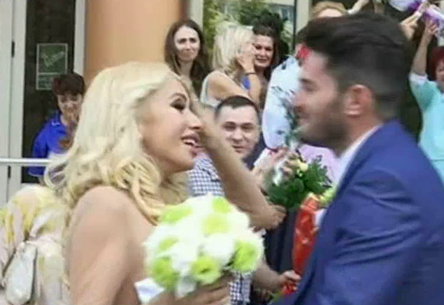 Imbracata intr-o rochie alba, scurta, cu decolteu si pene albe in partea de jos, Sonia a venit la bratul viitorului ei sot hotarata sa devina doamna cu acte in regula.