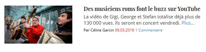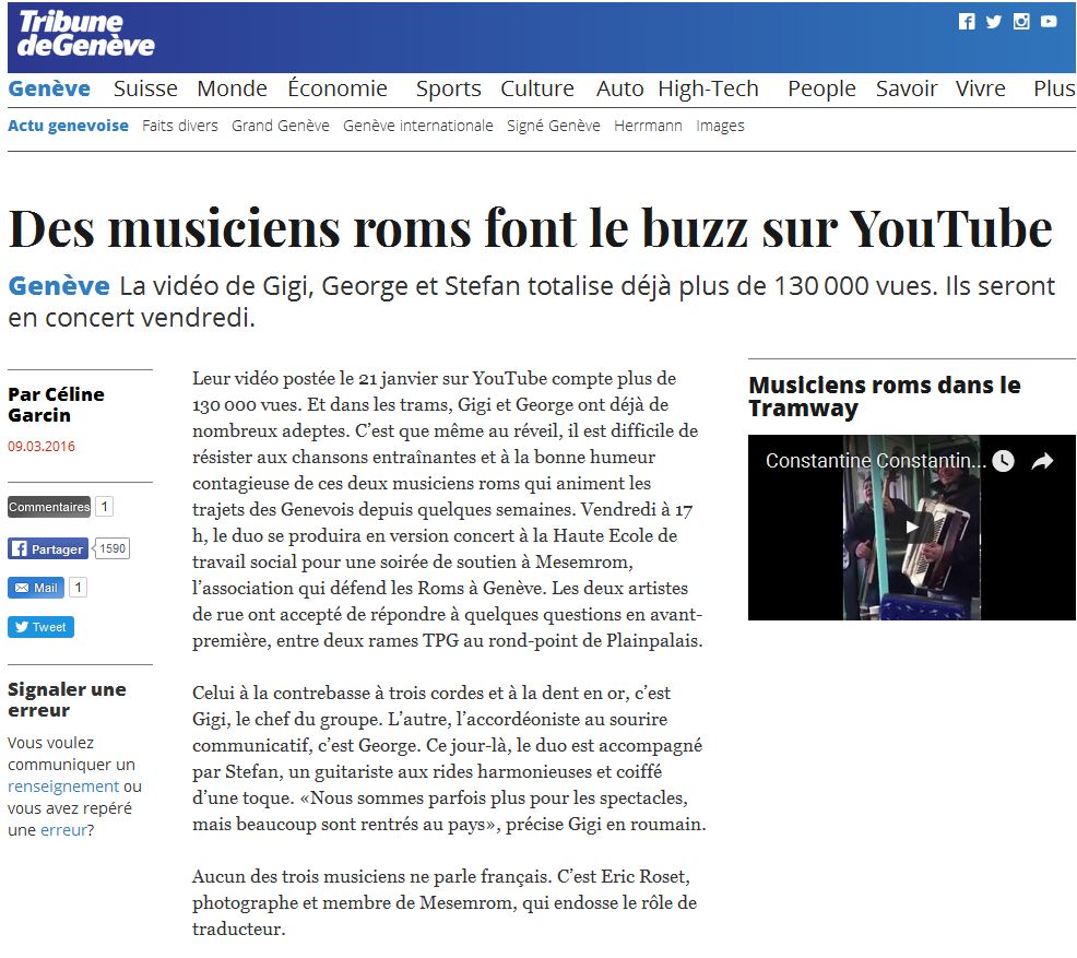 Articolul, in termeni laudativ, prezinta povestea celor doi romani care anima atmosfera in tramvaiul elvetian. Cei doi au reusit sa perfecteze si primul concert, pe care l-au sustinut la "Haute ecole de travail social", sprijiniti de Mesemrom, asociatia care apara drepturile romilor in Geneva.