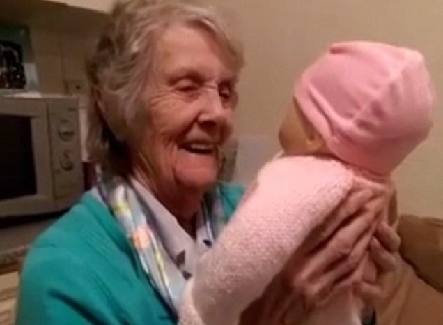 Nana Lilly sufera de dementa, iar nepoata sa, Maxine Daniel, a decis sa-i faca o surpriza. femeia a citit ca terapia cu papusi ajuta in ameliorarea acestei suferinte si i-a cumparat bunicii un bebelus si a filmat reactia ei in momentul in care l-a avut in brate.
