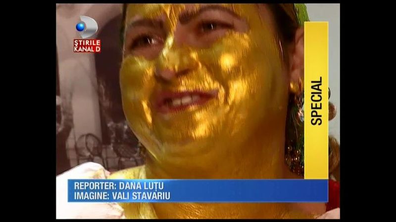 Sa scape de celulita si sa aiba cea mai fina piele. Pentru asta si-a pus pe fata si pe corp masca de aur. In doar cateva minute, Olga s-a transformat intr-o Cleopatra mioritica.