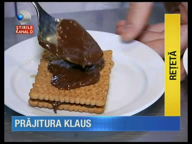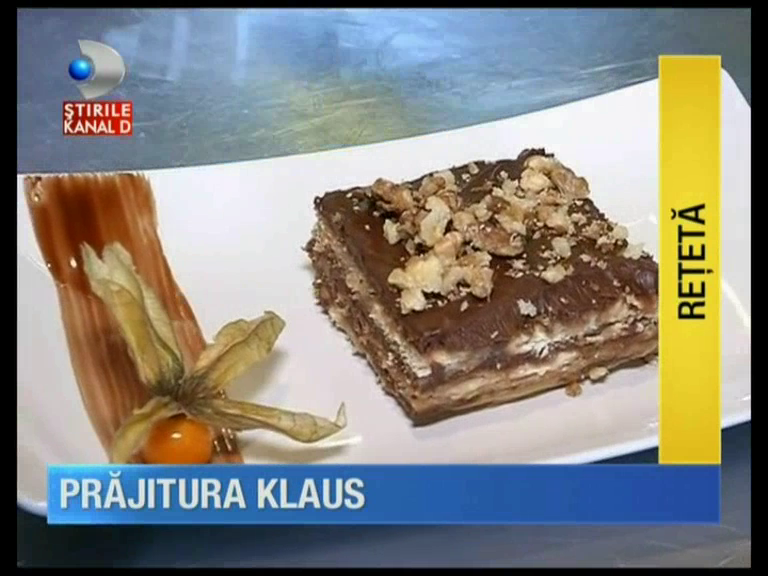 Pentru a pregati prajitura Klaus aveti nevoie de biscutiti, crema de ciocolata, frisca lichida, esenta de rom, cafea si miez de nuca. Se amesteca frisca lichida cu crema de ciocolata, dupa care se adauga putina esenta de rom. Inmuiati biscuitii in cafea, dupa care alternati un strat de biscuiti cu unul de crema. La final presarati miez de nuca si puneti prajitura la frigider pana se intareste.