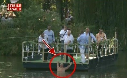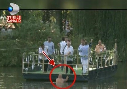 Ca sa ajunga pe insula, unde era organizata petrecerea, invitatii au trebuit sa treaca lacul pe un ponton care a tot facut drumuri de la un mal la celalalt. Lacul este insa loc de agrement si cum nunta a avut loc sambata, multi venisesa sa se relaxeze la umbra copacilor sau sa faca o baie. Un domn mai distrat nu a inteles probabil rolul acelui ponton care ii perturba baie si a decis sa protesteze. S-a prins cu mainile de marginea pontonului si nu s-a mai dat de acolo.