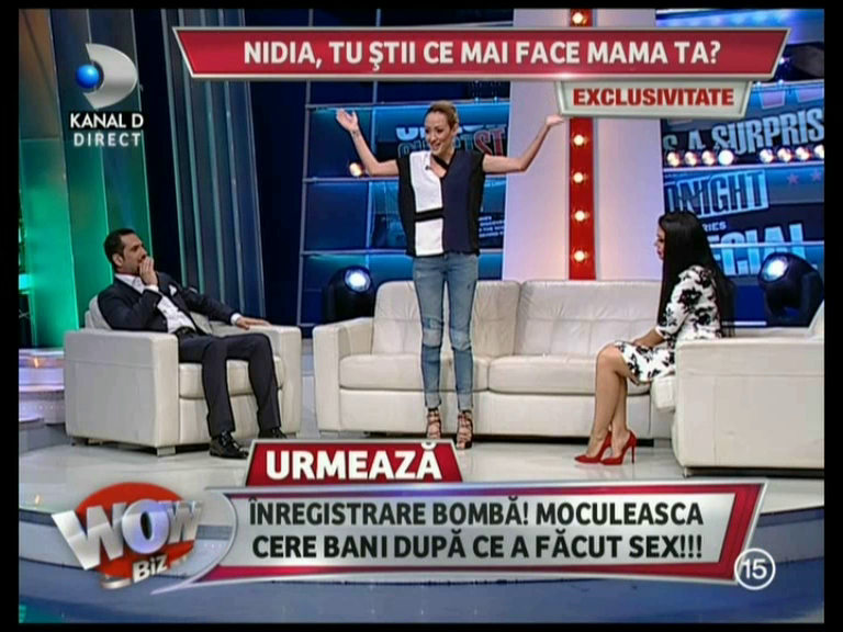 „Voi n-ati observat ca m-am ingrasat 9 kilograme de data trecuta. Vreau sa observe toata tara. Am luat un medicament care sa-mi tina mancarea acolo unde trebuie, sa nu se mai duca asa repede”, a declarat Nidia Moculescu la inceputul emisiunii WOWbiz.