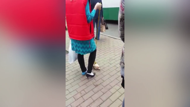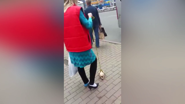 O femeie a reusit sa socheze toti trecatorii de pe strada. Imbracata curat, dar intr-un mod ciudat (are pantofi diferiti), a atras privirile cu 'animalul ei de companie'. Femeia are o lesa de pisici la capatul careia se afla un ham mic, tot de felina, in care sta... un pui mort! Imaginile au devenit rapid virale pe Facebook, majoritatea internautilor intrebandu-se daca nu cumva femeia are probleme mentale si nu se trateaza.