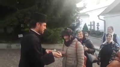 Un preot stropește credincioșii cu apă sfințită, aruncându-le cu agheasma direct în ochi.