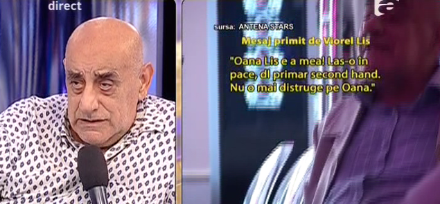 Cine esti tu sa o judeci pe Oana? Daca nu te potolesti, te distrug! Stiu ce masina ai si te prind eu in trafic. Te fac. O sa-ti vezi sfarsitul, dau cu masina peste tine! Daca nu te potolesti, te distrug! Stiu ce masina ai si te prind eu in trafic. Te fac. O sa-ti vezi sfarsitul, dau cu masina peste tine! Oana Lis e a mea! Las-o in pace, dl primar second hand. Nu o mai distruge pe Oana"- acesta este mesajul primit de Viorel Lis si prezentat la Antena 1.