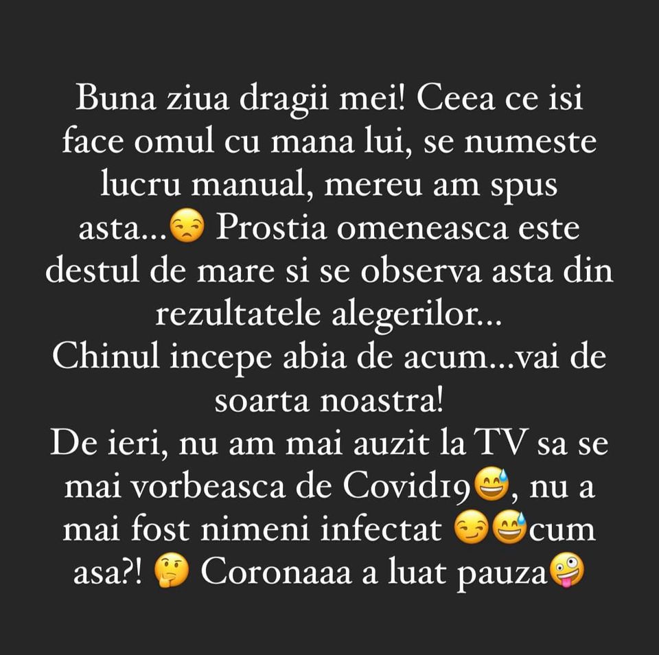 Viorica de la Clejani spune mai în glumă, mai în serios, că ieri nu a mai auzit nimic de coronavirus și că toată lumea a fost ocupată cu votările. Vedeta a lăsat de înțeles că de pe acum va începe chinul. În postarea făcută pe pagina ei de Facebook, mai multe internauți au fost total de acord cu cele spuse de ea.