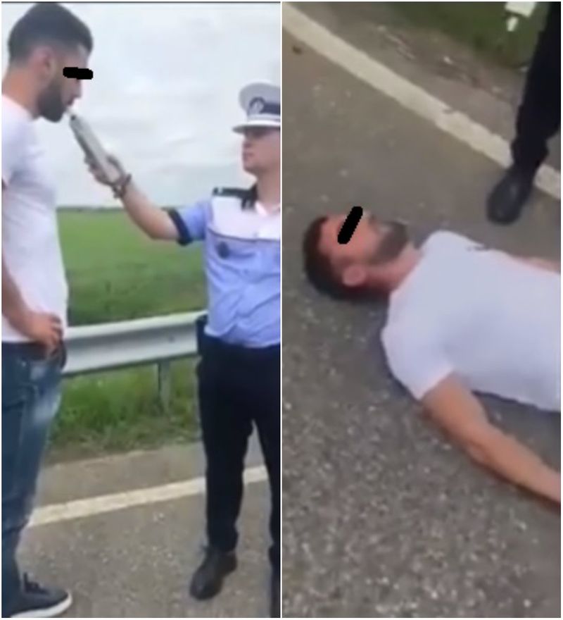 Viral: Imagini demențiale cu un șofer care suflă în etilotest, apoi leșină în fața polițiștilor