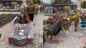 În imagini se poate vedea că un băiețel se află în interiorul unui tans rusesc realizat din carton, având desenat pe acesta „Z”, simbol caracteristic petru ruși, care apare pe vehiculele militare ale rușilor în războiul care are loc în Ucraina.