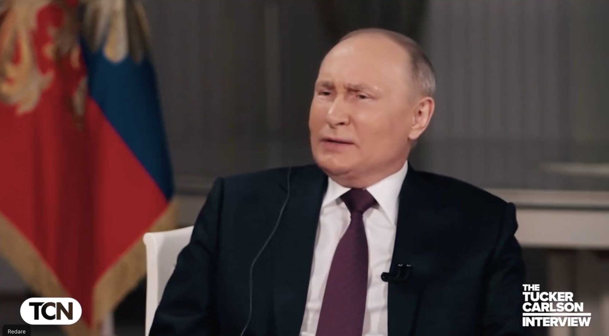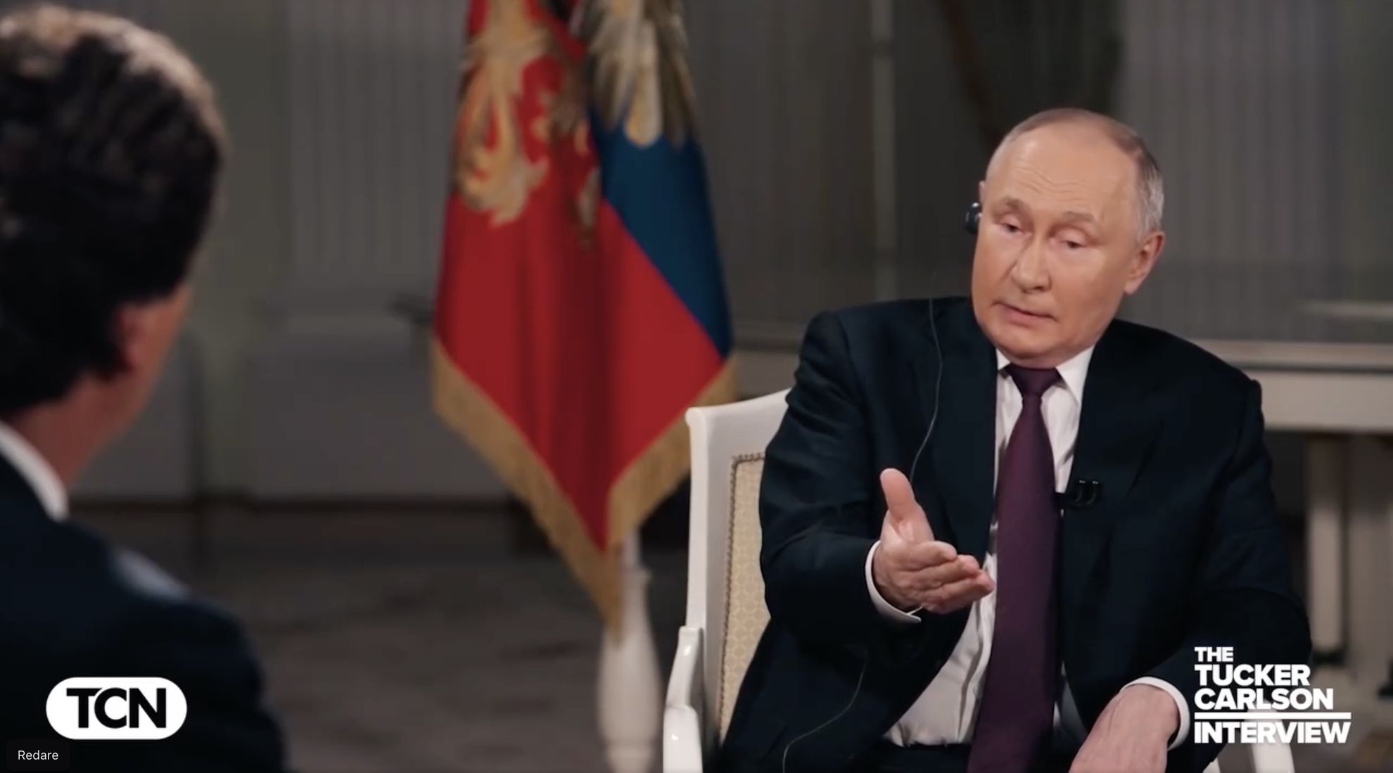 Vladimir Putin a oferit un interviu pe data de 6 februarie 2024 la Kremlin, jurnalistului și comentatorului politic Carlson Tucker. Liderul rus a lămurit și explicat în detaliu mai multe aspecte ce țin despre invazia Ucrainei, în ce condiții ar putea puncte capăt războiului, dar a vorbit și despre posibilitatea de a invada o țară membră NATO. În urma realizării unui scurt istoric despre formarea Ucrainei, Vladimir Putin a pus accentul pe ideea conform căreia țara ucraineană are cu totul alte sorginte decât cele care se vor a fi pretinse.