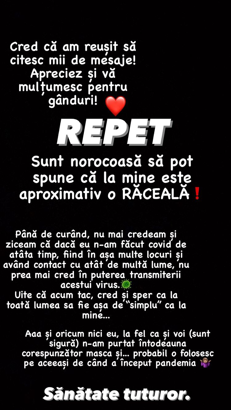 ” Dragii mei... vreau să vă spun că în urmă cu câteva zile am avut simptome specifice unei răceli, ca atare am luat decizia de a merge și a mă testa iar răspunsul din păcate a fost unul pozitiv.