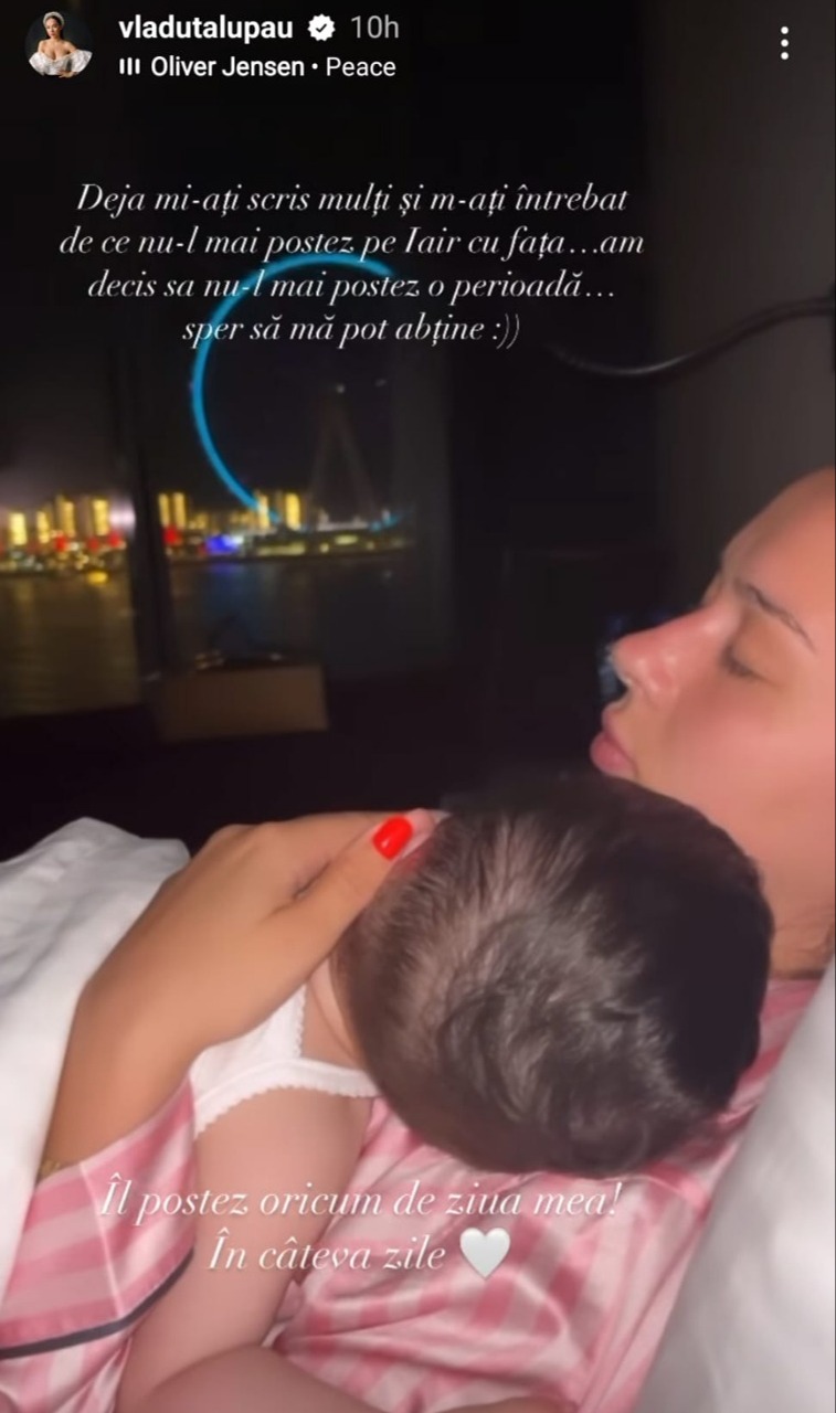 Vlăduța Lupău se află în vacanță în Dubai alături de soțul și micuțul ei fiu, Iair. Sunt plecați deja de câteva zile departe de casă, în una dintre cele mai vizitate și apreciate locații din întreaga lume, Dubai. Când fanii se așteptau că acum vor avea ocazia să vadă o mulțime de imagini de familie, în 3, au avut parte de o altfel de surpriză. Mai exact, artista a decis să-și nu mai posteze fiul cu fața o perioadă în mediul online, însă fanii au observat imediat acest lucru. După ce a primit mai multe întrebări legate de acest aspect, Vlăduța Lupău le-a transmis un mesaj fanilor săi, la rândul ei.