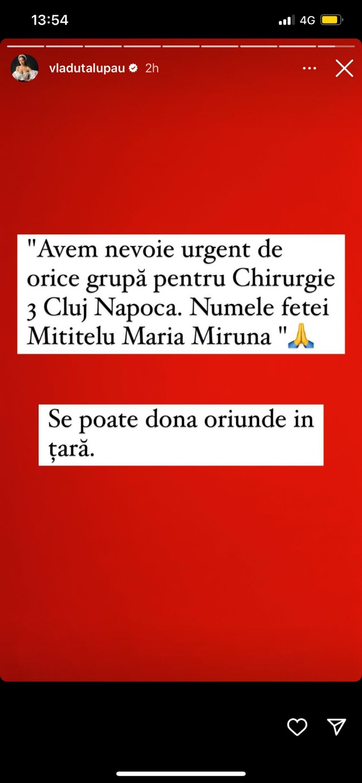 „Avem nevoie urgent de orice grupă pentru Chirurgie 3 Cluj-Napoca. Numele fetei Mititelu Maria Miruna. Se poate dona oriunde în țară.”, a fost mesajul transmis de Vlăduța Lupău, în mediul online.