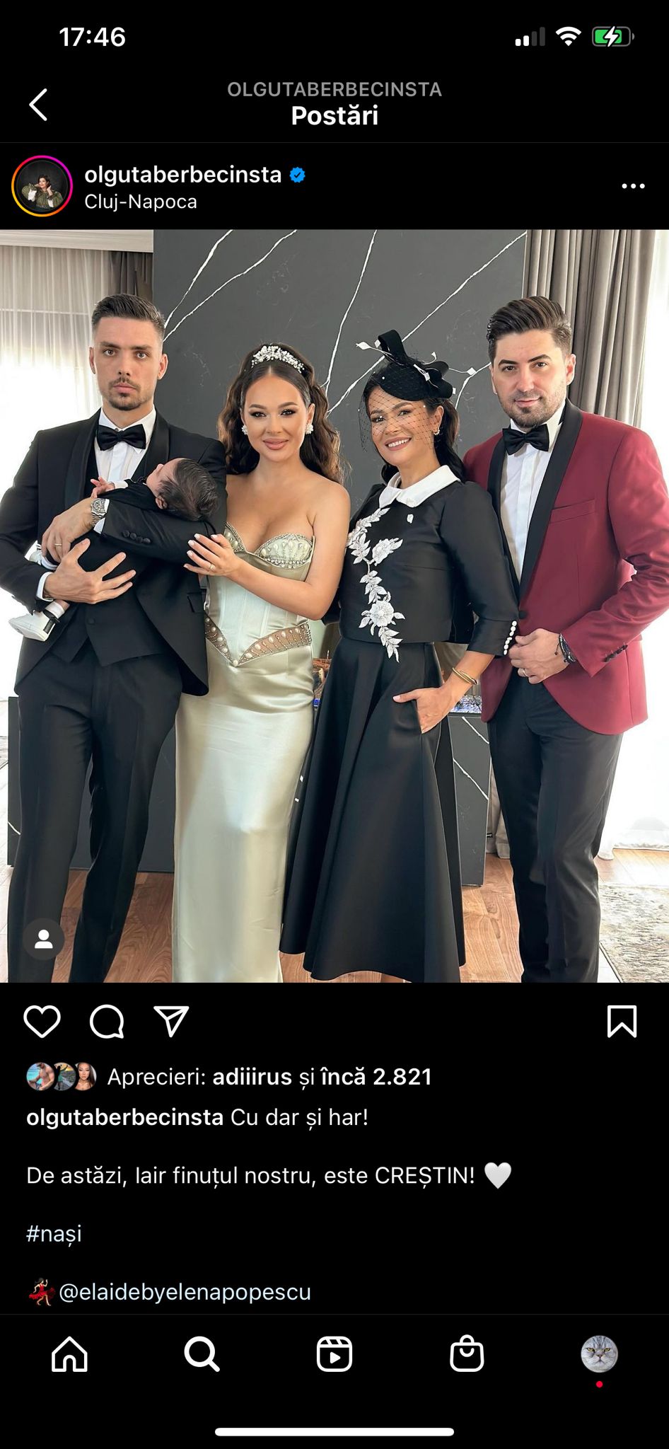 De precizat este că, nașa micuțului este chiar cunoscuta interpretă de muzică populară, Olguța Berbec, ce la rândul său a postat o imagine pe pagina personală de Instagram, alături de un mesaj prin intermediul căruia le-a transmis fanilor de pe rețeaua de socializare că Iair a fost botezat.