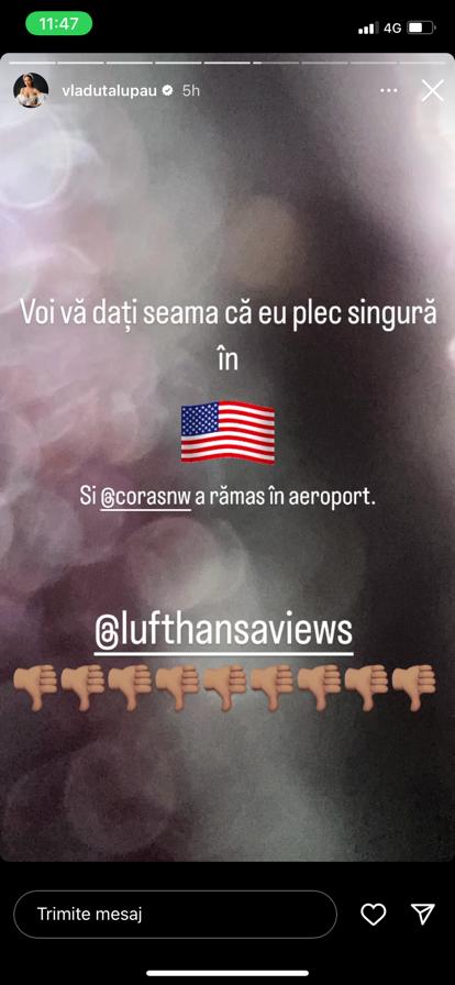 „Am primit foarte multe întrebări legate de ce s-a întâmplat, nu apuc să răspund la toate pentru că sunt ocupată să mă cert cu cei de la Luthansa. Eu am luat viza în 2019, înainte să mă căsătoresc, deci pe numele vechi. Acum am pașaport cu numele nou. La Ambasadă mi-au spus că nu este nevoie să îmi schimb viza, deoarece pot călători cu ambele pașapoarte (cel cu viza și cel cu numele nou + certificatul de căsătorie în original la mine). Problema a fost ca la check-in la Lufthansa nu au putut să îmi genereze biletul până nu au sunat în Germania, cei din Germania în US și înpoi în România. Am primit ok-ul de la Lufthansa la ora 6:13, în condițiile în care eu am ajuns la aeroport la 4:30, și avionul a plecat la 6:20. Pentru că am pierdut primul zbor, nu am cum să le prind nici pe următoarele, iar cei de la Lufthansa nici nu m-au ajutat cu o soluție, au spus că nu au cum să mă pună pe alt zbor și că sunt șanse să mi se anuleze și returul pentru că nu am făcut prima parte din zbor, așa că mi-am cumpărat singură un alt bilet de avion și am să plec astăzi la ora 14. Vlăduța Lupău, așteaptă-mă.”, a spus Andreea Rus pe Instagram.