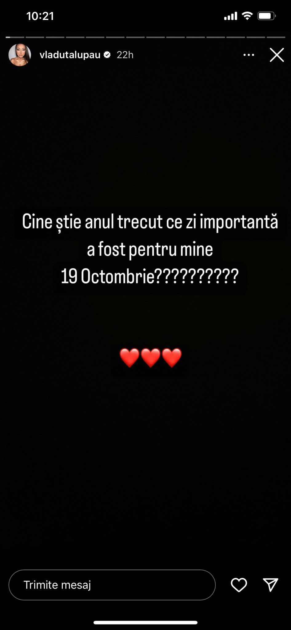 „Cine știe anul trecut ce zi importantă pentru mine a fost 19 octombrie?”, a scris Vlăduța Lupău pe Instagram.