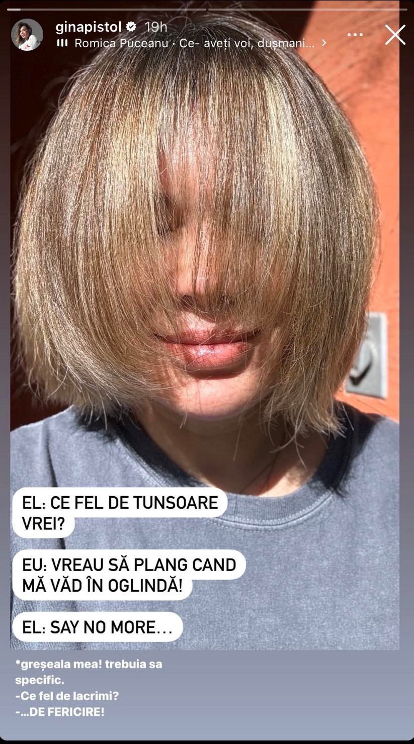 În postarea de pe rețelele de socializare, Gina Pistol a făcut haz de necaz, povestind că a realizat abia acum care a fost greșeala făcută de ea în această situație. Mai precis, vedeta regretă că nu i-a specificat hairstylistului că lacrimile pe care ar fi vrut să le verse când s-ar fi văzut în oglindă ar fi trebuit să fie unele de fericire, nu de tristețe, așa cum i s-a întâmplat ei.