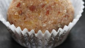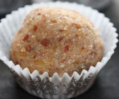 Punem fructele uscate in apa cu esenta de rom. Dupa ce s-au inmuiat, le scurgem bine de apa si le dam prin blendar. Le amestecam cu fulgii de ovaz pana obtinem un aluat usor de modelat.