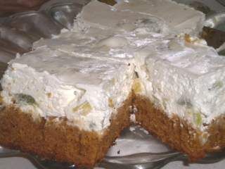 Topping-ul este facut dintr-un strat gros frisca batuta si amestecata cu bucatele de kiwi, ananas si mandarina.