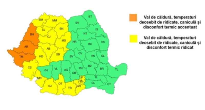 Codul portocaliu de caniculă este valabil sâmbătă, 16 august, între orele 12:00 și 21:00. Afectează județele Bihor, Arad și Timiș, acolo unde disconfortul termic este accentuat și indicele temperatură-umezeală (ITU) va depăși pragul critic de 80 de unități, iar temperaturile maxime ating 37-38 de grade Celsius.