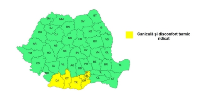 Cod galben de arșiță este și duminică, 17 august, între orele 12.00 și 21.00, în sudul Olteniei, sud-vestul și centrul Munteniei. Valorile maxime vor fi de 35-36 de grade Celsius.