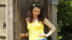 In imaginea cu pricina, „Gianina” este nemachiata, imbracata intr-o tinuta lejera si cu un zambet larg.