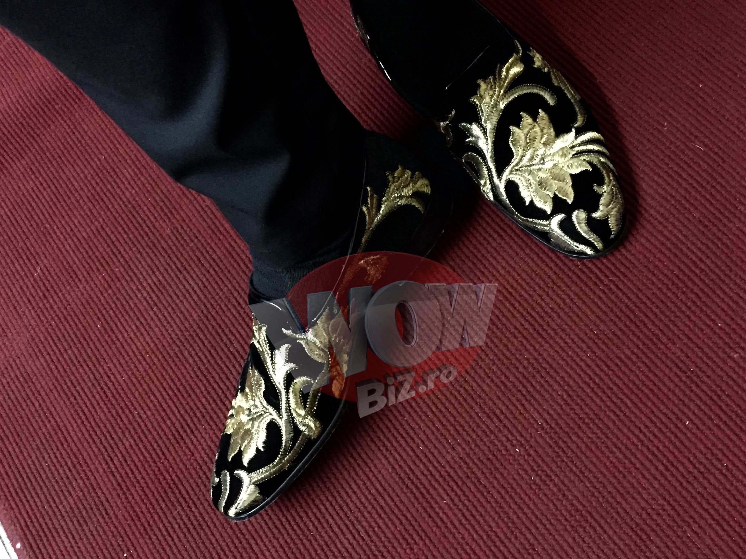 Fuego a ales sa se incalte cu o pereche de pantofi extravaganti, negri, din piele intoarsa, cu o broderie aurie, in trend cu tendintele modei masculine din acest sezon, o dovada certa ca el acorda, acum, si o mare atentie si imaginii sale.