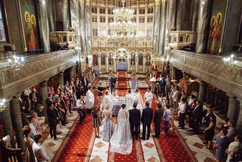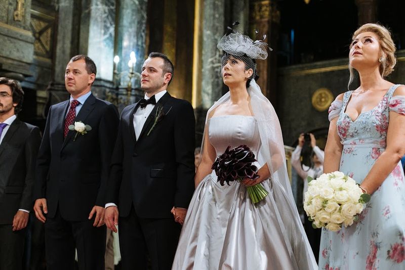 Ceremonia a fost oficiata de 7 preotiLa biserica Sophia a venit cu o masina rosie retro, la bratul tatalui ei, purtand o rochie gri perla, inspirata din rochiile purtate de doamnele de la curtea regala, realizata de prietena ei Galyna, iar pe cap a avut o creatie semnata Kristina Dragomir, coc format din mai multe cuburi, pietre negre lipite sub pleoapa de jos si un machiaj noncomformist si original, cale negre in mana si lacrimi de emotie in priviri. Sapte preoti, printre care si duhovnicul ei din orasul natal Roznov au tinut slujba de casatorie.