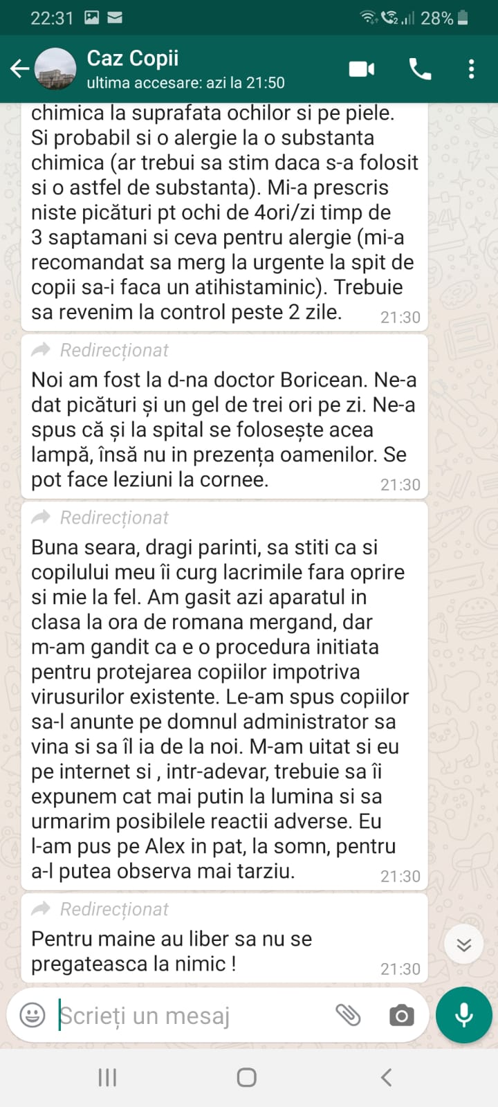 Pe la 15,00 fetița s-a plâns de dureri la ochi. Am fost la un cabinet oftalmologic unde ni s-a spus că este vorba despre arsuri. Imediat după ce am fost la cabinet, a apărut scris și pe grupul școlii că mai mulți copii au avut probleme la ochi, au lăcrimat, i-a usturat sau li s-a înroșit fața. Se pare că lampa respectivă ar fi fost lăsată în clasa cu elevi vreo 2 ore. Știu ca se folosește, dar nu în prezența persoanelor.