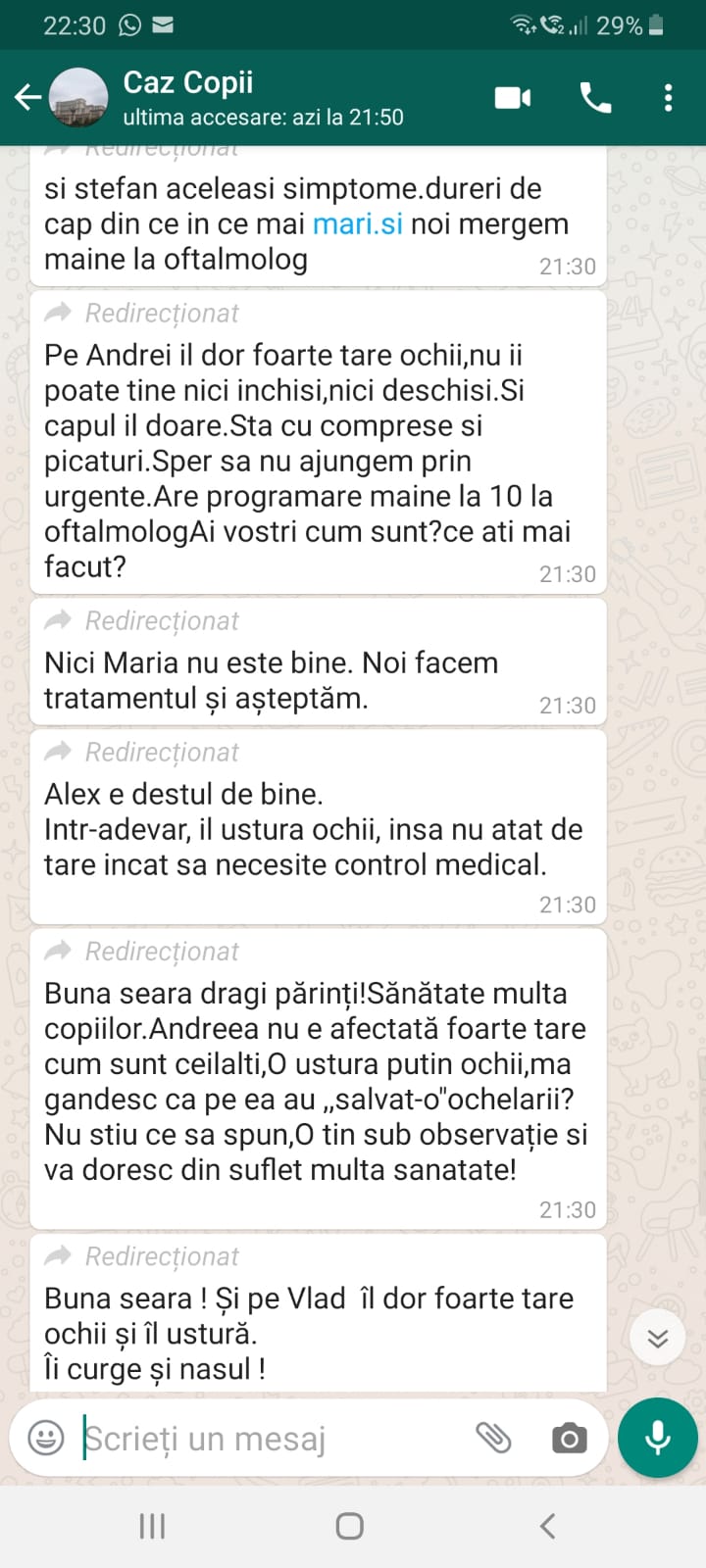 „Copilul meu este roșu ca racul. Are dureri de cap, ochii o ustură foarte tare și vede în ceață”, a mai spus cineva de pe grup.